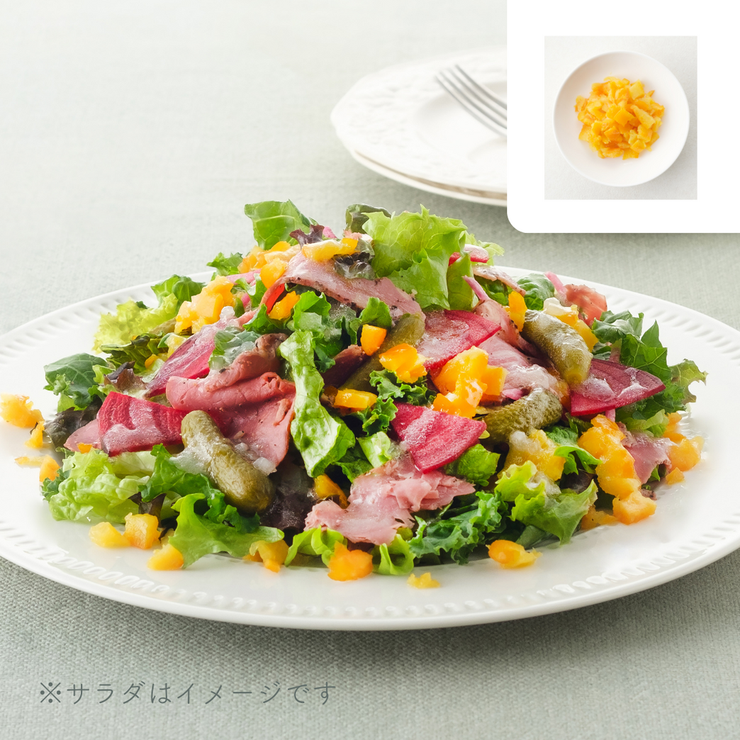 「フルーティートッピング オレンジピール」は、ネーブルオレンジのピールに果汁を浸透させ、濃厚でフレッシュな風味を実現した、フルーツのトッピングです。果物だけの甘さで、スッキリとしていて、ジューシーな仕立てです。 サラダにかけるだけで、いつもと違ったおしゃれな一皿に仕上がります。また、ヨーグルトやお菓子のトッピングとしても使うことができます。サラダにもスイーツにもさまざまに使える新感覚のフルーツのトッピング。華やかな色合いと風味でいつもの料理をランクアップします。 ●商品の改訂などにより、お手元の商品と当ホームページでは記載内容が異なる場合があります。必ずお手元の商品を確認してください。